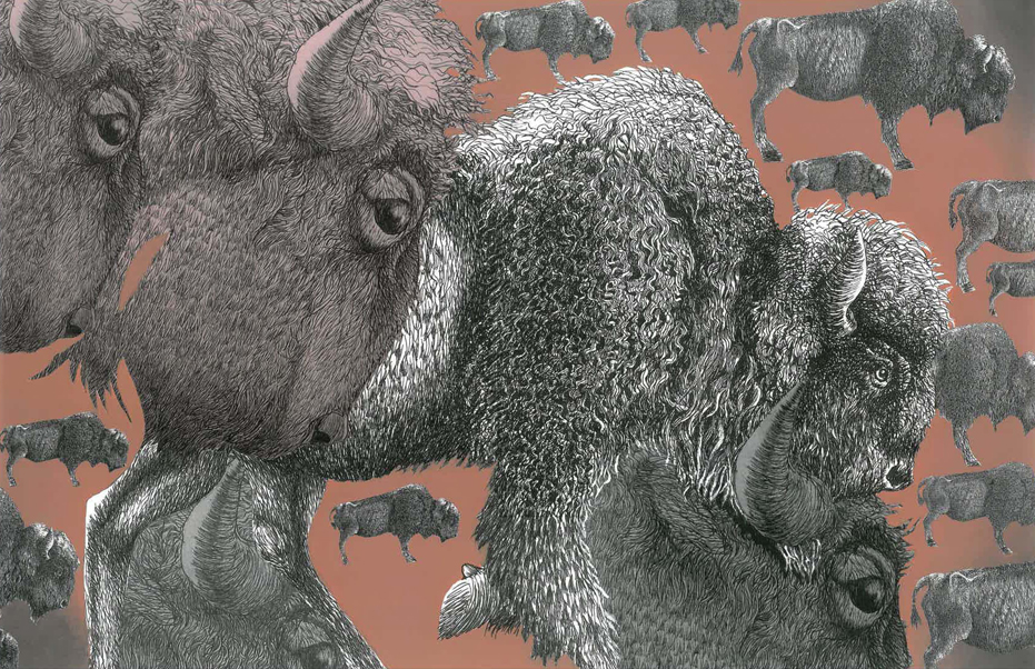 Once, a steam locomotive would be stopped in its tracks for 2 days while herds of bison crossed. What happened? I made the drawing of this American bison from a small herd in the backyard of Al Wolf.
